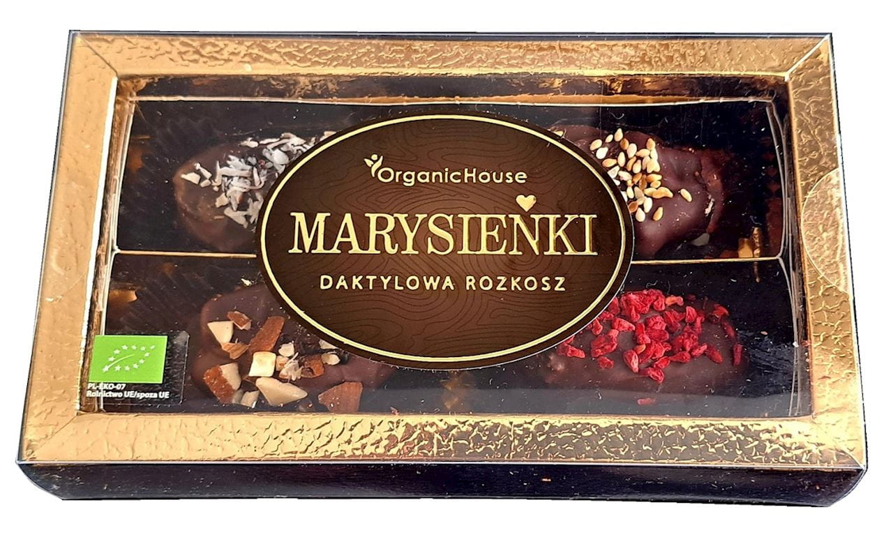 DAKTYLE MEDJOOL OBLANE CIEMNĄ CZEKOLADĄ Z NADZIENIEM I POSYPKĄ BEZGLUTENOWE BIO 110 g - ORGANICHOUSE (MARYSIEŃKI) (PRODUKT SEZONOWY)