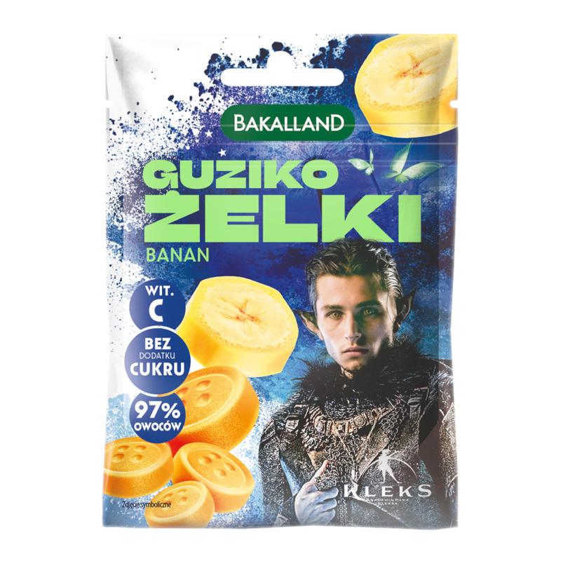 Żelki owocowe GUZIKO ŻELKI BANAN BAKALLAND to propozycja naturalnej przekąski serii KLEKS. Żelki nie zawierają dodanych cukrów (są w nich cukry naturalnie występujące w owocach), są bez żelatyny (zagęszczane pektyną). Smak jabłkowo - bananowy, z dodatkiem witaminy C.