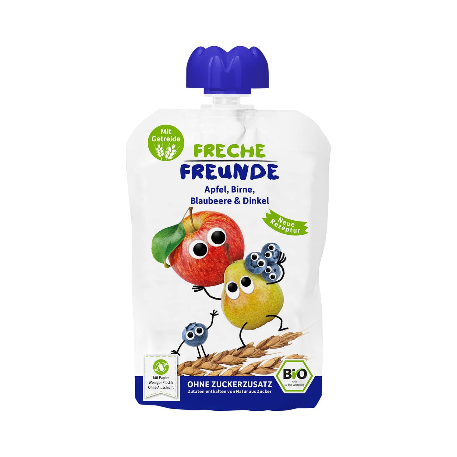 MUS JABŁKO - GRUSZKA - BORÓWKA - ORKISZ BEZ DODATKU CUKRÓW OD 6 MIESIĄCA BIO 100 g - FRECHE FREUNDE