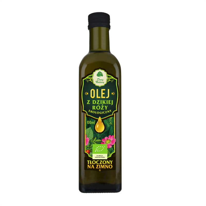 Ekologiczny olej z dzikiej róży tłoczony na zimno. Olej z dzikiej róży ma łagodny smak, dobrze harmonizuje z sałatkami jak i daniami mięsnymi.