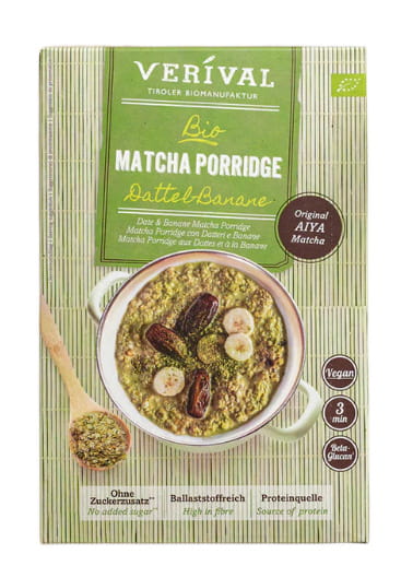 OWSIANKA BŁONNIKOWA Z DAKTYLAMI, BANANEM I MATCHĄ BEZ DODATKU CUKRÓW BIO 350 g - VERIVAL