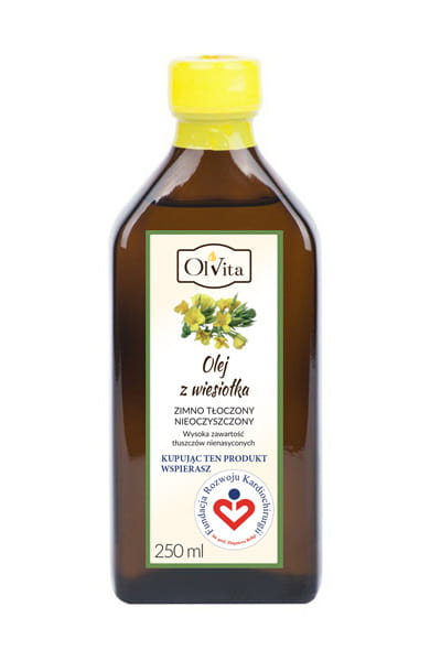 Olej ten tłoczony jest na zimno z nasion wiesiołka dwuletniego. Jego nasiona są bogate w kwas gamma- linolenowy (GLA), który jest niezbędny do prawidłowego funkcjonowania organizmu. . Kwas GLA zawarty w nasionach wiesiołka pozwala uzupełniać niedobór enzymu Delta 6-desaturaza. Oddziaływanie zdrowotne Stosowany w profilaktyce i leczeniu miażdżycy, pomaga obniżyć poziom cholesterolu, zmniejsza groźbę powstawania zakrzepów (ma właściwości antykoagulacyjne). Stosowany w początkowych stadiach SM zmniejsza drętwienie i osłabienie kończyn. Znacznie pomaga w leczeniu łuszczycy, egzemie, trądziku i wielu chorób skórnych, wyraźnie poprawia wygląd skóry, włosów i paznokci. Zwiększa ogólną odporność organizmu, leczy schorzenia alergiczne takie jak: astma alergiczna, nieżyt nosa i inne. Zmniejsza nadmierną aktywność u dzieci nadwrażliwych, pomaga w zespole napięcia przedmiesiączkowego, mastalgii (bolesność piersi), pomaga w leczeniu reumatyzmu i artretyzmu. Działa wspomagająco przy leczeniu chorób przemiany materii. Spożywanie oleju z wiesiołka wspomaga również odchudzanie. Dawkowanie: dorosłe osoby dziennie 6-8 gramów oleju (można mieszać go z mlekiem lub innymi płynami bądź spożywać z posiłkami) a dzieci dawkę 3-4-gramową. Zastosowanie w kosmetyce Olej ten może być stosowany bezpośrednio na skórę, w tym celu należy 3-4 krople oleju wmasować opuszkami palców w oczyszczoną skórę twarzy. Masować skórę przez około 30 sekund aż do pełnego wchłonięcia. Olej stosuje się zarówno przy skórze suchej, łuszczącej się, atopowej, wrażliwej, dojrzałej (w kremach przeciw zmarszczkowych) jak i tłustej ze skłonnością do zanieczyszczeń. Olej z wiesiołka reguluje wilgotność, przemianę komórkową i pracę gruczołów łojowych, regeneruje, łagodzi swędzenia, poprawia elastyczność skóry. GLA jest prekursorem prostaglandyny (PGE1) odpowiadającej za prawidłowy stan skóry. Brak GLA ( ilość maleje z wiekiem)oznacza zatem suchą, zwiotczałą skórę, skłonną do przedwczesnego marszczenia, przebarwień i podrażnień. Kwas gamma linolenowy zapewnia skórze właściwą odporność a zaaplikowany bezpośrednio w skórę, odmładza ją. Ma również kolosalne znaczenie w leczeniu różnego rodzaju dolegliwości skórnych (sucha skóra, podrażnienia, egzema, wypryski, łojotokowe zapalenie skóry, niektóre rodzaje łuszczycy itp.).