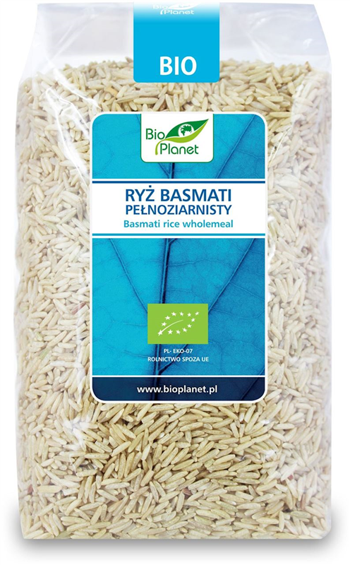 Ekologiczny ryż Basmati pełnoziarnisty charakteryzuje się subtelnym orzechowym smakiem i niepowtarzalnym aromatem. Stanowi najszlachetniejszą odmianę ryżu na świecie. Doskonały jako dodatek do mięs, sałatek, dań egzotycznych i deserów. Ryż Basmati pełnoziarnisty zachowuje wszystkie cenne składniki znajdujące się w łusce, dzięki czemu jest bardziej wartościowy niż ziarno obłuszczone.