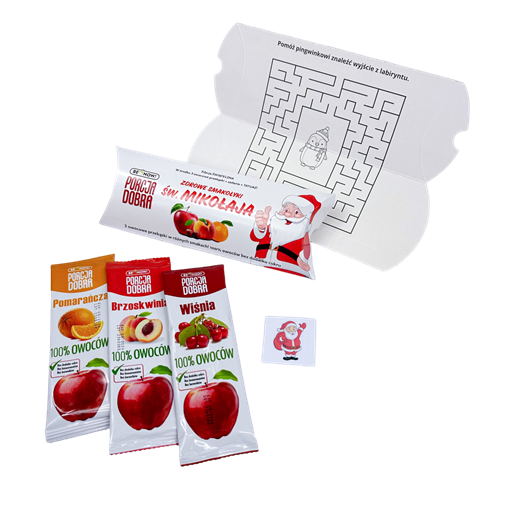 Zestaw składający się z 3 owocowych przekąsek w różnych smakach. Dodatkowo w środku dziecko znajdzie tatuaż i specjalne zadanie od Świętego Mikołaja rozwijające zdolność dedukcji, uważność, logiczne myślenie lub kreatywność.