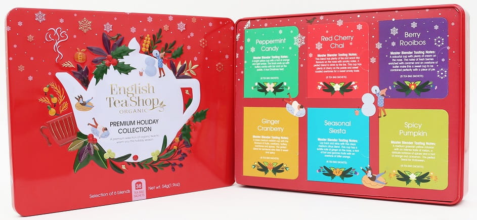 SKŁADNIKI Peppermint Candy - Ekologiczna herbata zielona z miętą pieprzową, skórką z pomarańczy, cynamonem, cykorią i wanilią. Składniki: herbata zielona* (32,5 %), liście mięty pieprzowej* (32 %), skórka z pomarańczy* (11 %), cynamon* (14 %), cykoria* (5 %), naturalne aromaty (5 %), strąki wanilii* (0,5 %). (*certyfikowany składnik ekologiczny) Red Cherry Chai - Ekologiczna herbata czarna z cynamonem, imbirem, kardamonem, goździkami, anyżem i cykorią. Składniki: herbata czarna* (45 %), cynamon* (16 %), imbir* (10 %), kardamon* (6 %), goździki* (6 %), anyż* (6 %), cykoria* (6 %), naturalne aromaty (5 %). (*certyfikowany składnik ekologiczny) Berry Rooibos - Ekologiczna herbatka z rooibosem, jabłkiem, maliną, jagodą, żurawiną i cynamonem. Składniki: rooibos* (73 %), jabłko* (10 %), naturalne aromaty (5 %), malina* (3 %), jagoda* (3 %), żurawina* (3 %), cynamon* (3 %). (*certyfikowany składnik ekologiczny) Ginger Cranberry - Ekologiczna herbata czarna z cynamonem, imbirem, goździkami, żeń-szeniem i żurawiną. Składniki: herbata czarna* (69 %), cynamon* (15 %), imbir* (6 %), naturalne aromaty (5 %), goździki* (3 %), żurawina* (2 %). (*certyfikowany składnik ekologiczny) Seasonal Siesta - Ekologiczna herbatka z trawą cytrynową, cynamonem, imbirem, garcynią, hibiskusem i skórką z cytryny. Składniki: trawa cytrynowa* (36 %), cynamon* (20 %), imbir* (19 %), liście garcynii* (10 %), hibiskus* (7 %), naturalne aromaty (5 %), skórka z cytryny* (3 %). (*certyfikowany składnik ekologiczny) Spicy Pumpkin - Ekologiczna herbata zielona z cynamonem, anyżem, imbirem, kardamonem, goździkami, gałką muszkatołową i pieprzem czarnym. Składniki: herbata zielona* (83 %), naturalne aromaty (5 %), cynamon* (2,5 %), anyż* (2 %), imbir* (1,5 %), kardamon* (1,5 %), goździki* (1,5 %), gałka muszkatołowa* (1,5 %), pieprz czarny* (1,5 %). (*certyfikowany składnik ekologiczny) OPIS Zestaw prezentowy 36 saszetek z ekologiczną herbatą i herbatką w 6 różnych smakach. Skomponowany z myślą o możliwe największej poprawie Twojego samopoczucia z użyciem naturalnych składników. SPOSÓB PRZYGOTOWANIA Peppermint Candy - Saszetkę zalać 250 ml wrzącej wody i zaparzać przez 2-3 minuty. Red Cherry Chai - Saszetkę zalać 250 ml wrzącej wody i zaparzać przez 4-5 minut. Berry Rooibos - Saszetkę zalać 250 ml wrzącej wody i zaparzać przez 3-5 minut. Ginger Cranberry - Saszetkę zalać 250 ml wrzącej wody i zaparzać przez 4-5 minut. Seasonal Siesta - Saszetkę zalać 250 ml wrzącej wody i zaparzać przez 2-3 minuty. Spicy Pumpkin - Saszetkę zalać 250 ml wrzącej wody i zaparzać przez 2-3 minuty. ZALECANE WARUNKI PRZECHOWYWANIA Przechowywać w suchym i chłodnym miejscu.